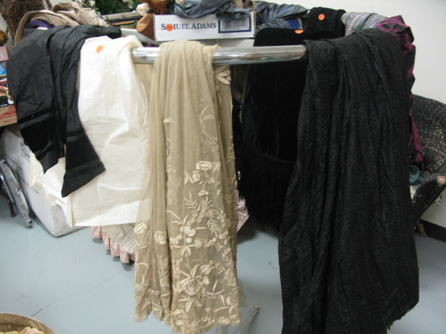 Rack of vintage and Victorian clothing and hats