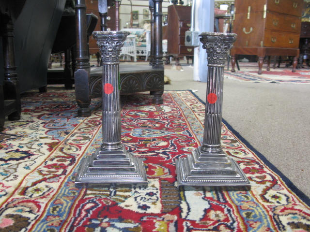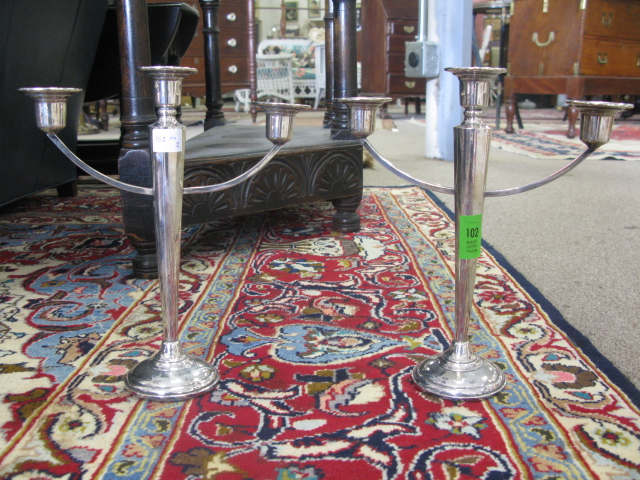 Pair of sterling silver three light candelabra with weighted bases, dents in base