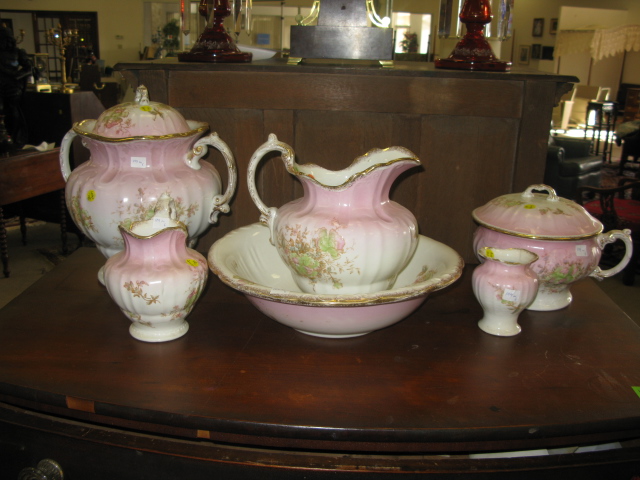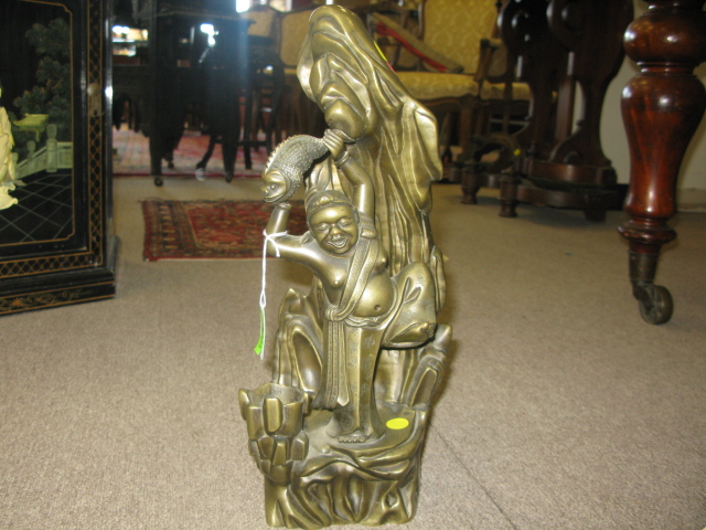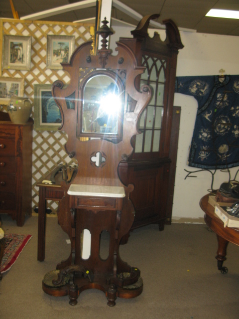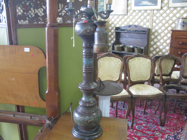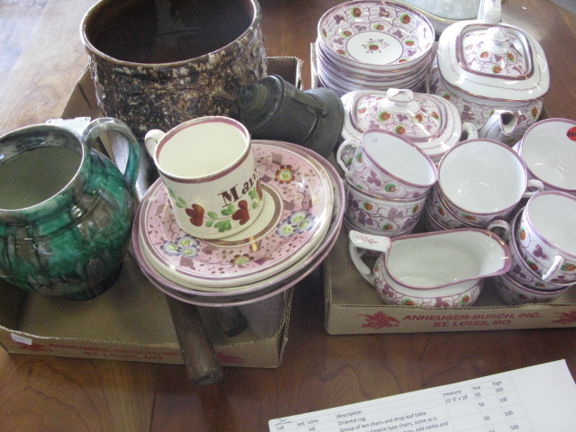 Two box lots of copper luster plates, cups, saucers, teapots, sugar, planter, pitcher, lamp, couple wooden primitive items, etc.