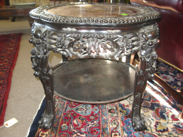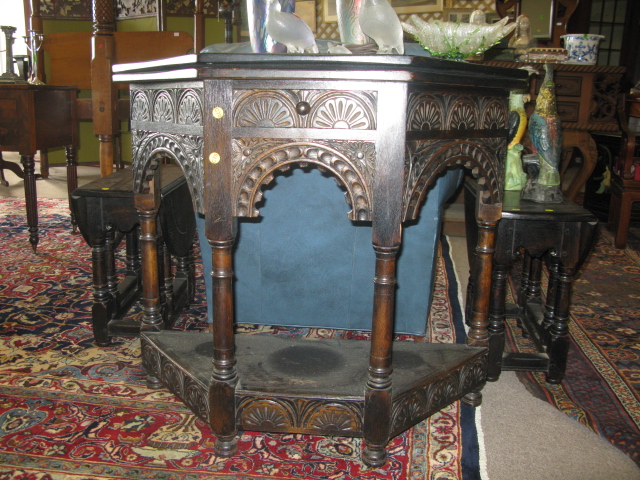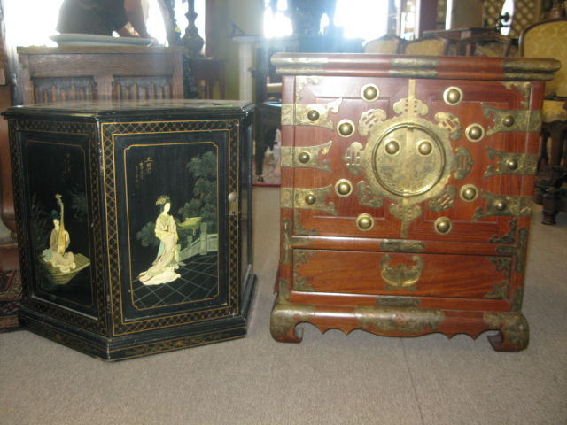 Two Oriental style tables, octagon lacquered table and teak brass mounted table