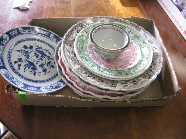 Box lot of eleven pieces, eight Staffordshire plates, one Staffordshire cup, delft plate, and Export cup
