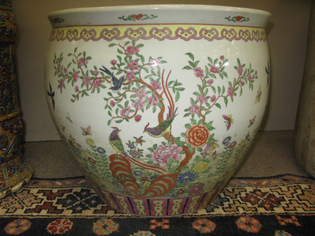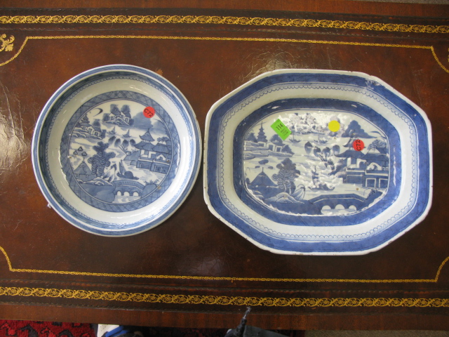 Two Canton pieces, round shallow dish and platter, dish has chip and crack
