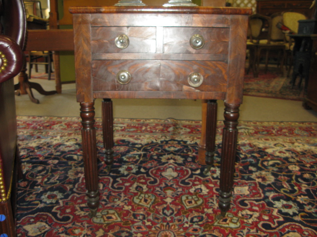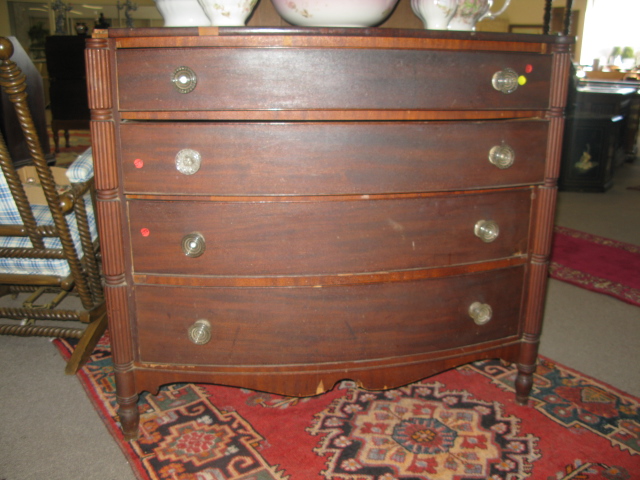 Sheraton bowfront chest, one cookie corner off, veneer damage