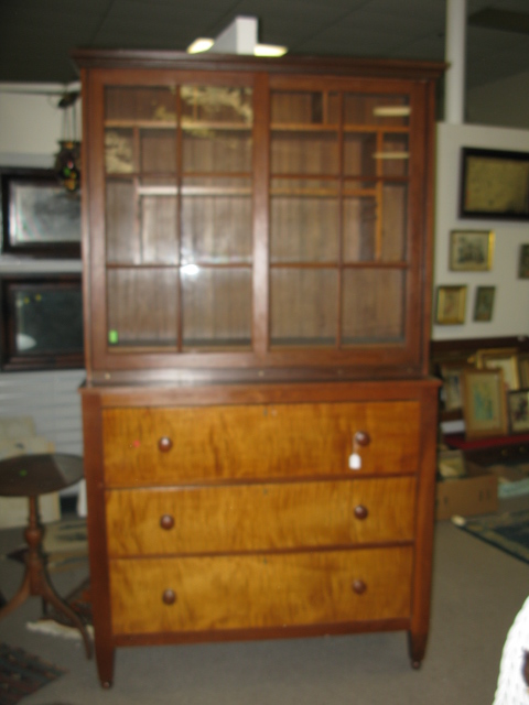 Chest with bookcase top with sliding doors and three tiger maple drawer fronts