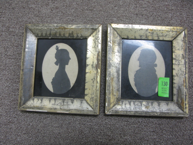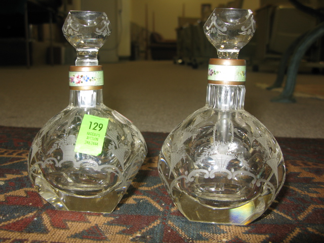 Pair of etched crystal perfume bottles with dapper and brass enameled mounted on neck, chip on inside top of one bottle