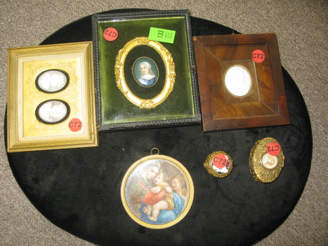 Six piece lot including two small hinge covered boxes, one with enameled top, one with small painting, two shell cameos in a frame and misc.