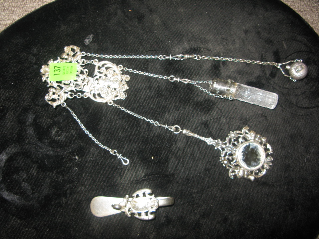 Silver chatelaine with perfume scent bottle mounted with multi metal, mirror and two belt hooks