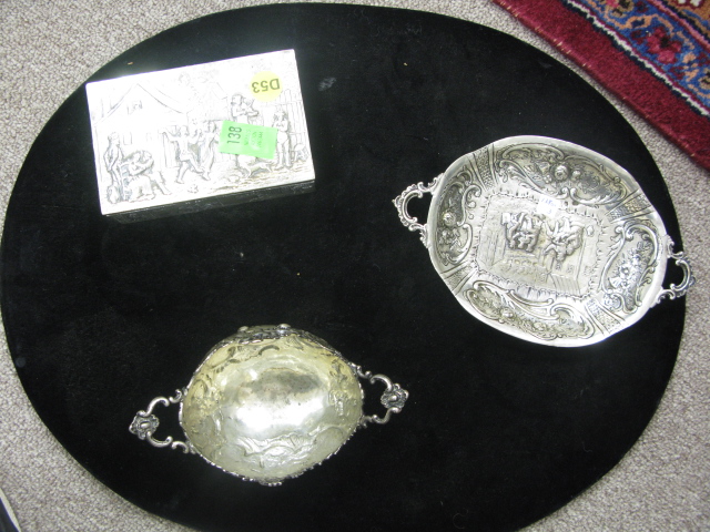Three piece Continental silver lot to include box with wood inside, sugar bowl and small tray
