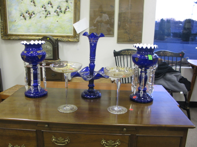 Five piece lot to include epergne, two girandoles in cobalt, one as is and two crystal and gold compotes