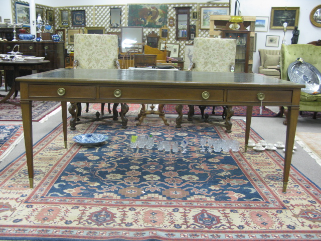 Kittenger mahogany leather top writing desk with three drawers on square tapered legs