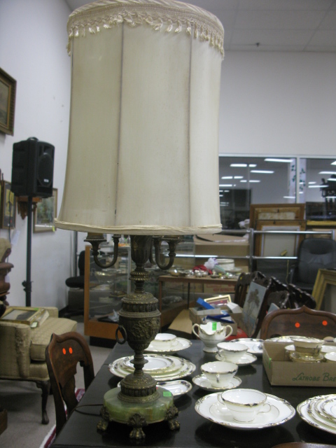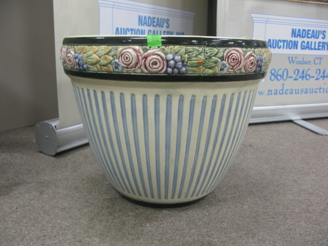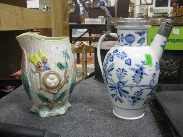 Meissen pitcher with pewter top and spout marked with cross swords along with a majolica reproduction pitcher