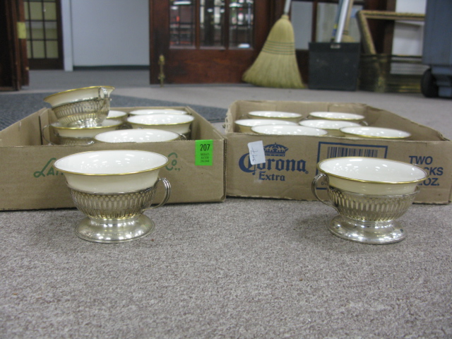 Set of fifteen sterling cups with Lenox inserts, nine of one size, six of one size, one with a rim chip