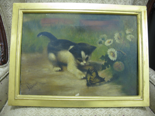 Oil on board cat chasing butterfly signed lower left J. Dolph signed lower right with initials I.U.E.