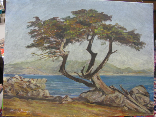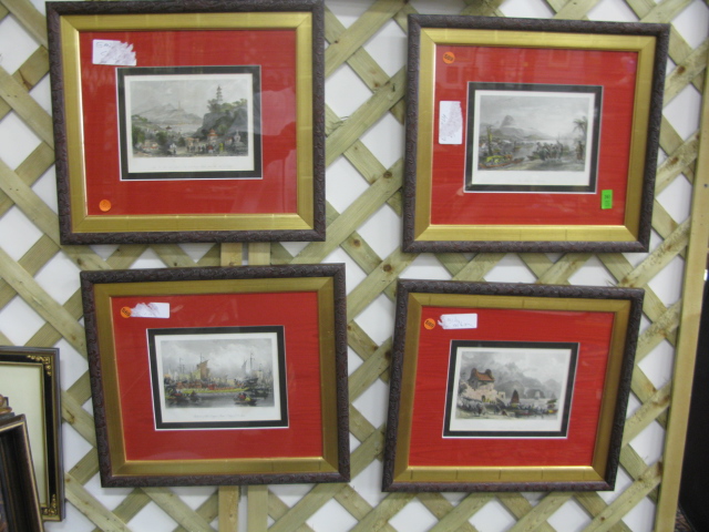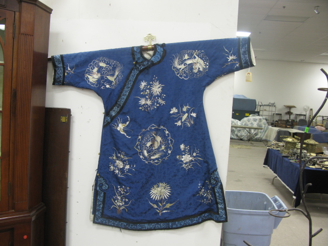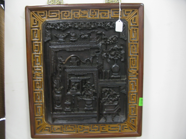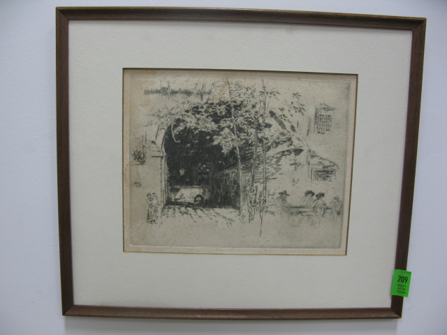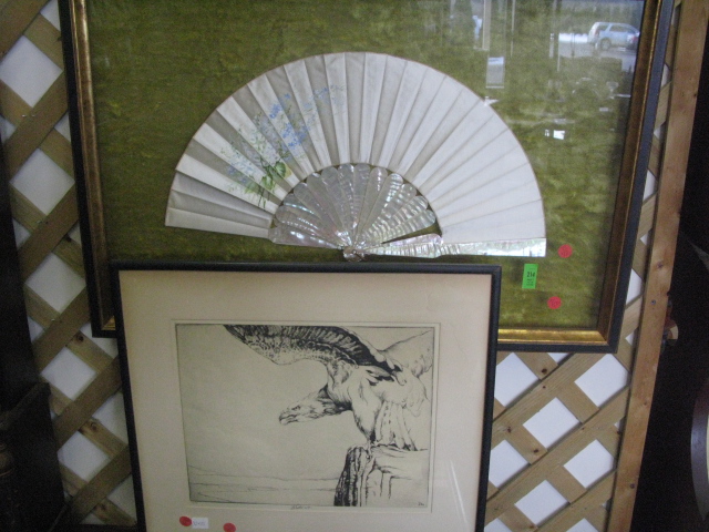 Two piece lot to include mother of pearl and silk fan in shadowed box case and etching of eagle signed Tuttle