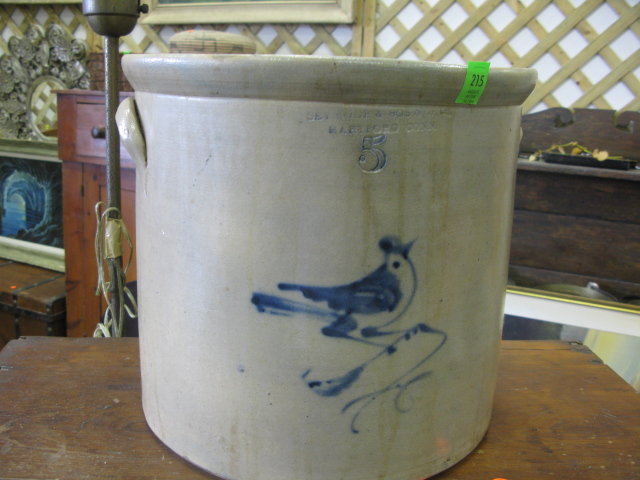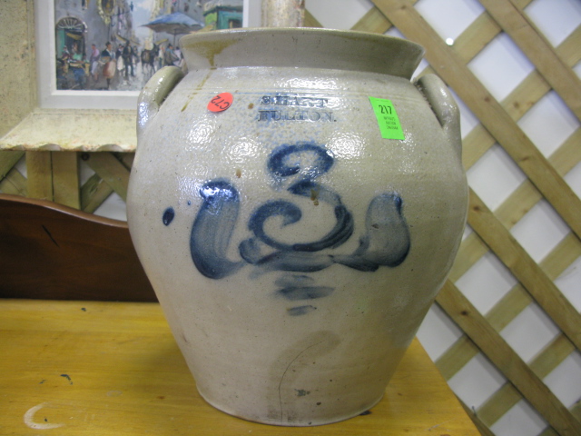 Stoneware ovoid crock marked S. Hart Fulton three gallon with blue decoration small crack in bottom