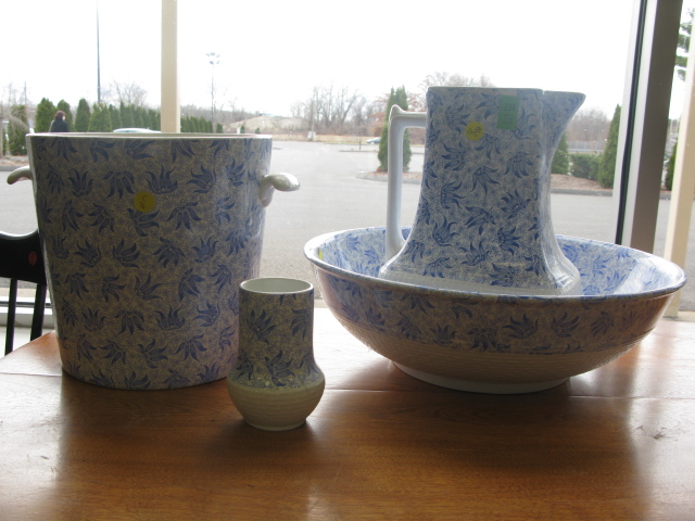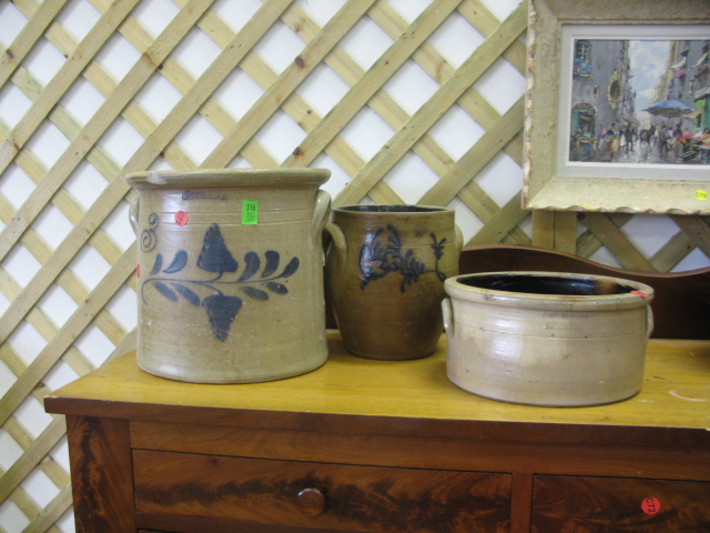 Three piece lot stoneware to include three crocks, two with blue decoration, chip on one rim