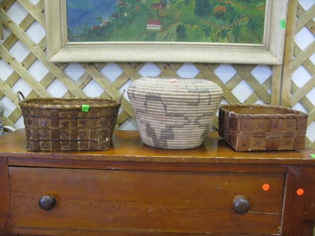 Three American Indian baskets, two with paint decoration, one is coil basket