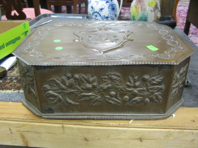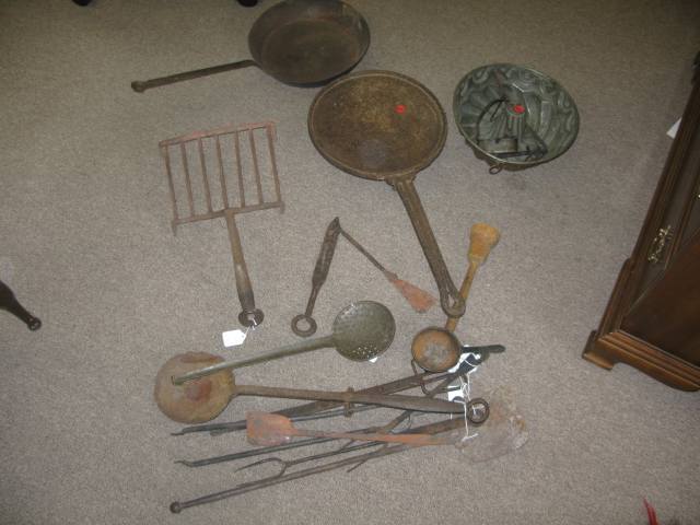 Large iron lot to include roaster, skillet, copper mold, iron tools, tin tole betty lamp, strainer, and misc.
