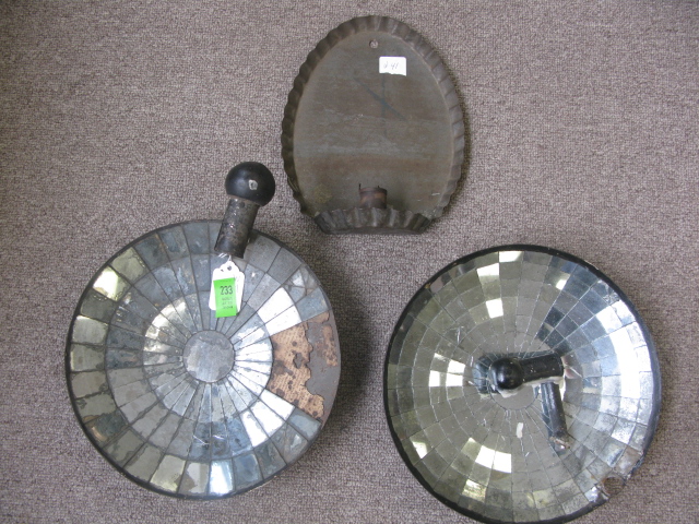 Three primitive sconces, two with mirror reflectors, one candle holder off