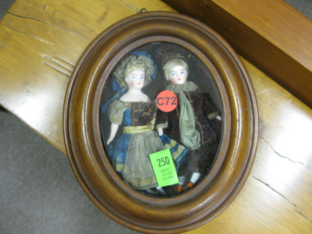 Victorian oval shallow box frame with two miniature bisque dolls inside