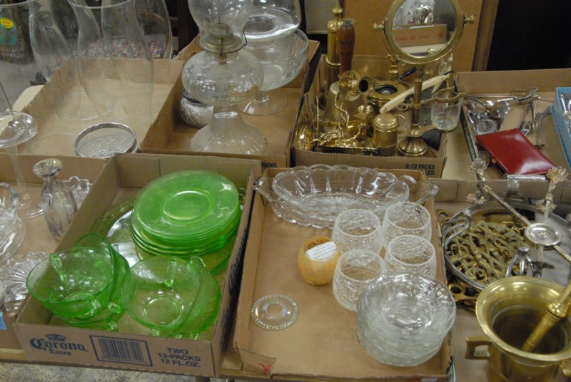 9 box lots to include green depression glass, various press glass, chimneys, glass shaving mirror, silver plated flatware, candlesticks
