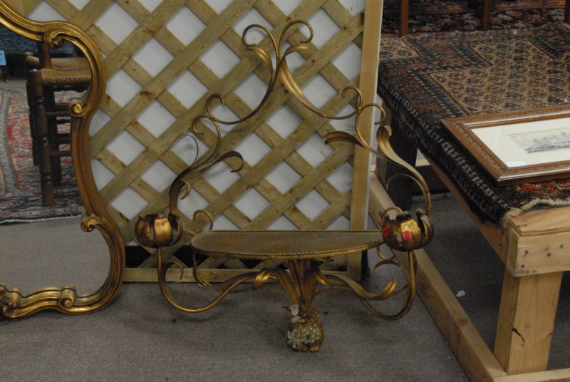 Gold mirror and gold metal shelf.