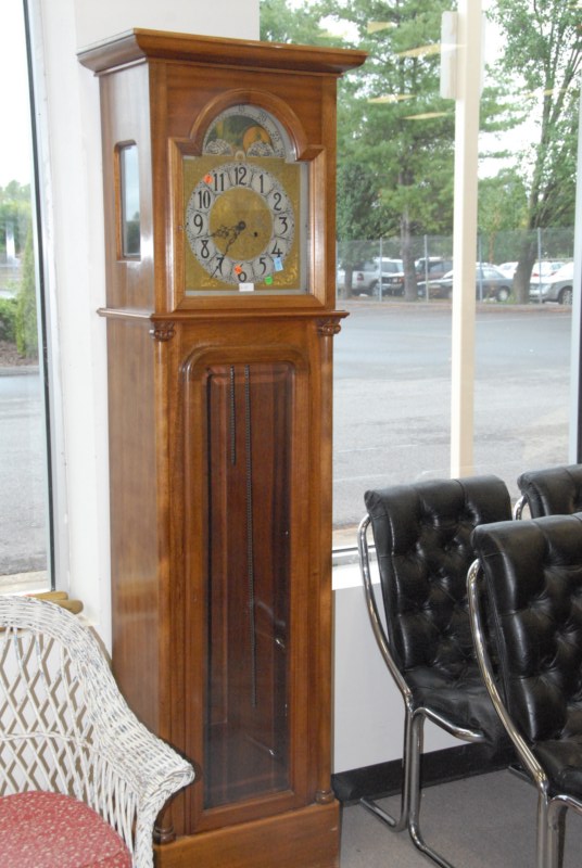Mahogany grandfather clock with brass weights