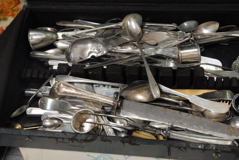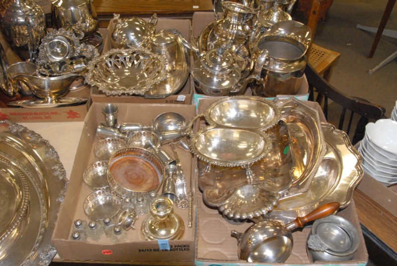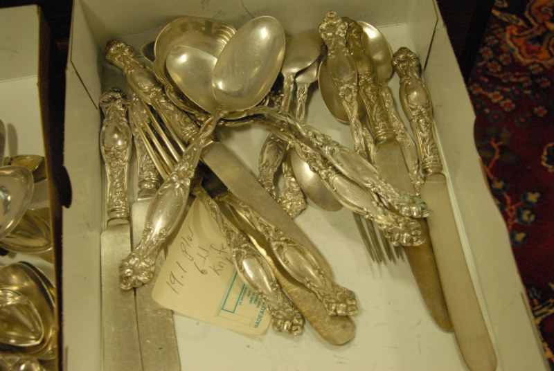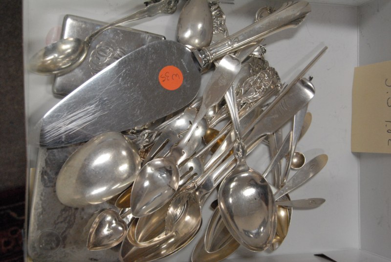 3 boxes of mostly silver plated items, possibly sterling handle knives