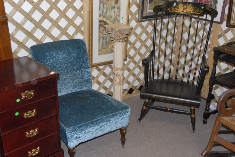 6 pc lot to include Boston rocker, cane rocker, pedestal, 2 blue upholstered chairs, and bull’s eye mirror.