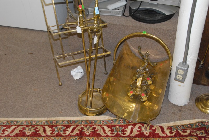 Brass lot including log holder, two stands, tools and rack.