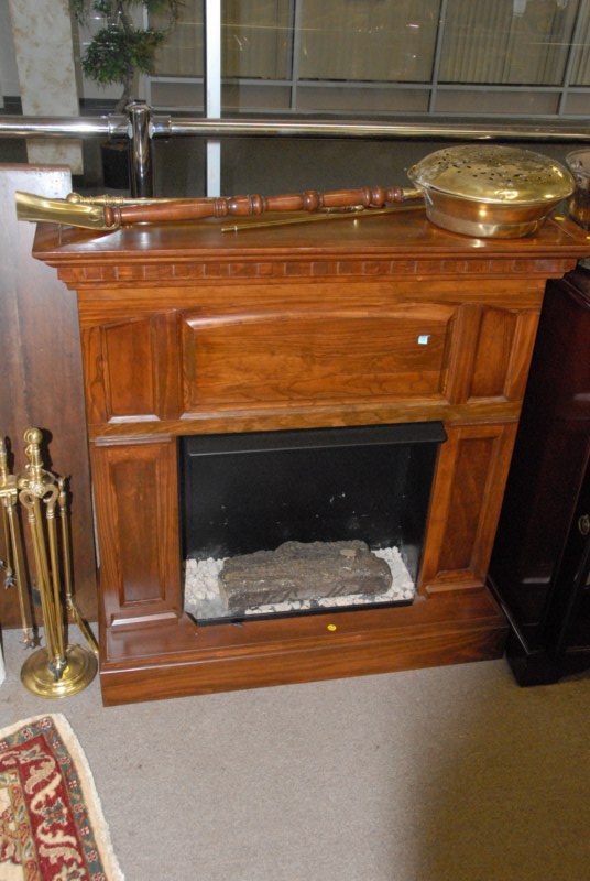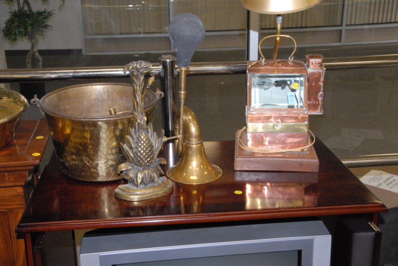 Lot to include fireplace mantle, bed warmer, fireplace tool, brass bucket, brass doorstop and horn.
