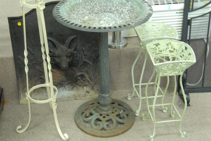 6 pc lot to include birdbath, fireback, fire screen, 3 metal plant stands.