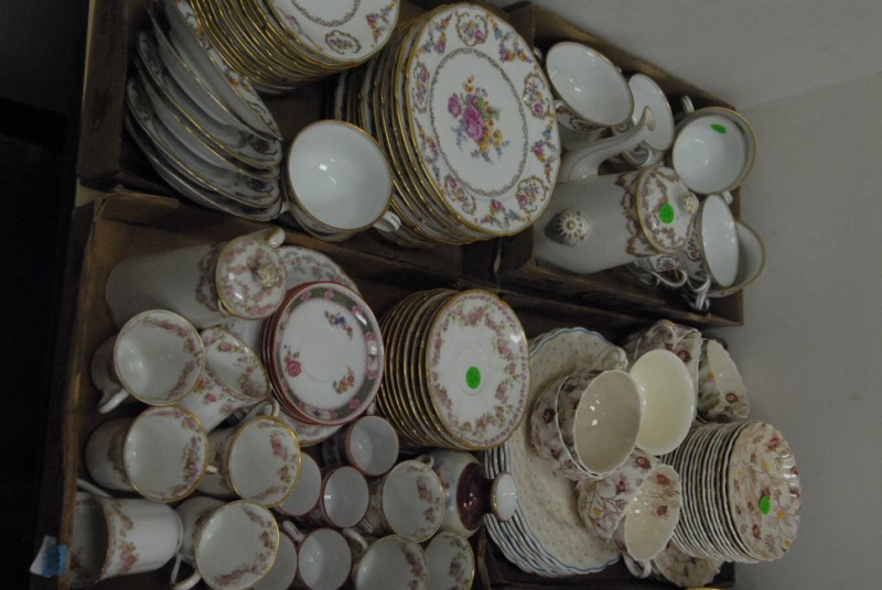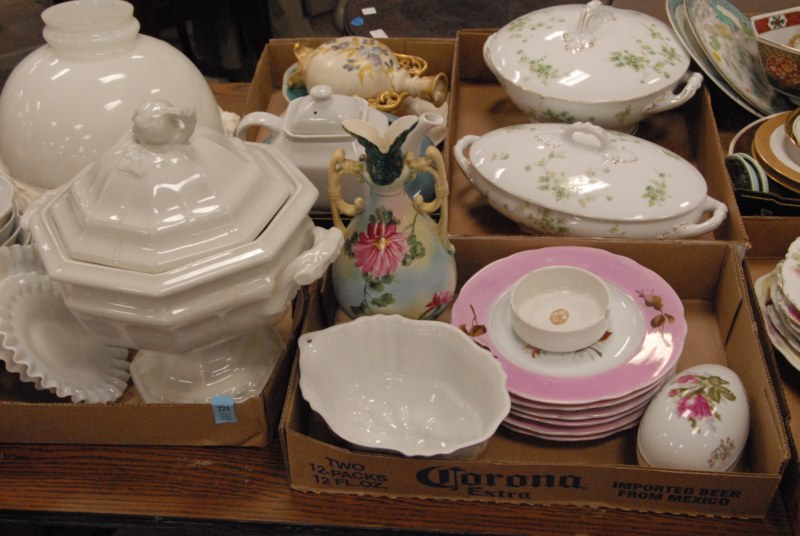 9 box lots of china to include a tureen, plates, cups, saucers, covered dishes, shades, etc.