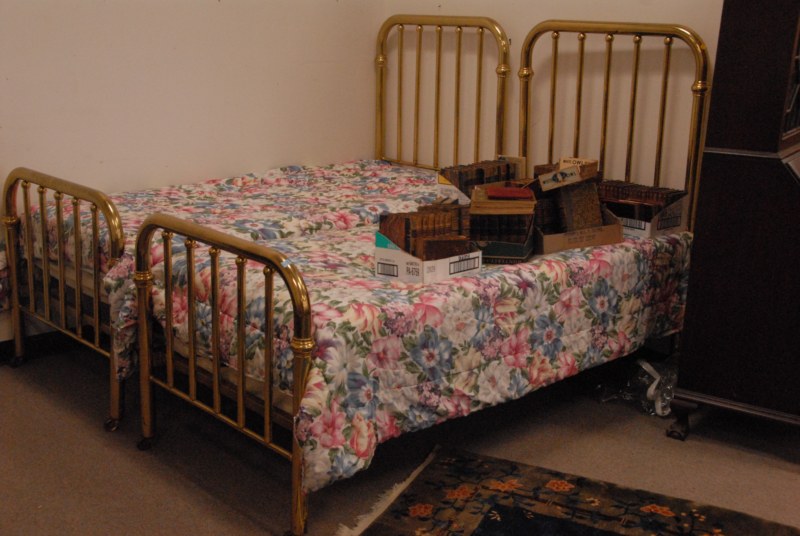 Pair of brass beds complete with mattresses.