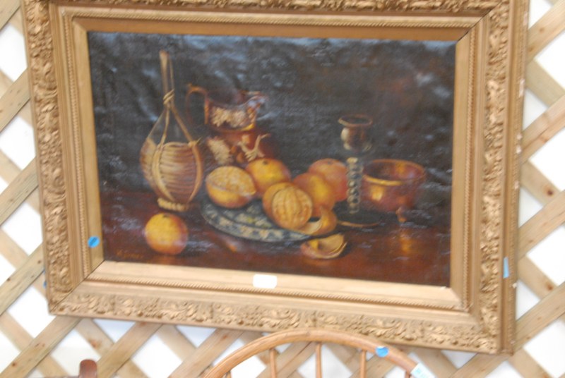Oil on canvas, STILL LIFE OF FRUIT ON TABLE, signed lower left, M Green.