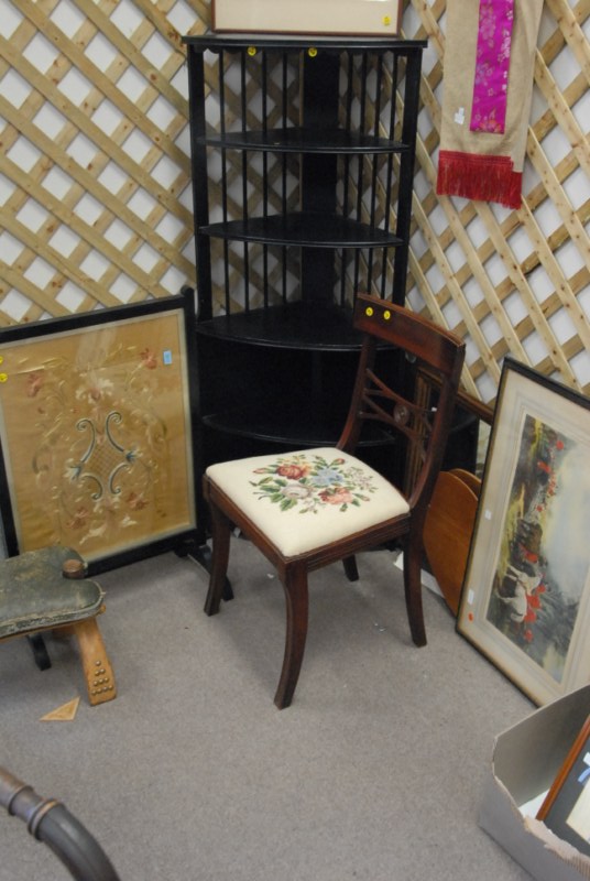 Group lot to include a camel saddle, firescreen, side chair and corner shelf