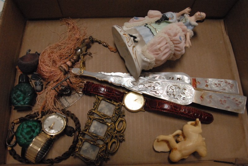 Box lot to include Victorian hair watch chain, 2 small perfume bottles, small silver jewelry, fan, wristwatch, figure, gold plated wristwatch, ivory monkey