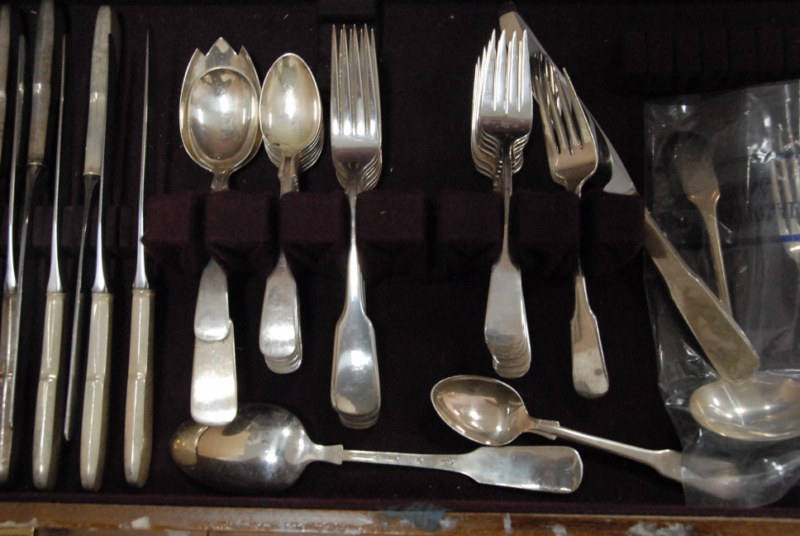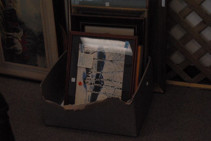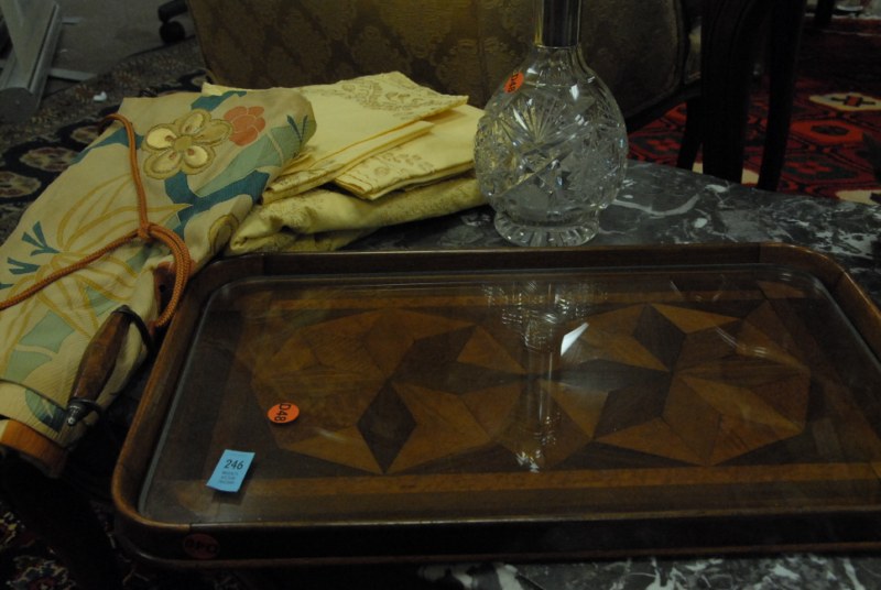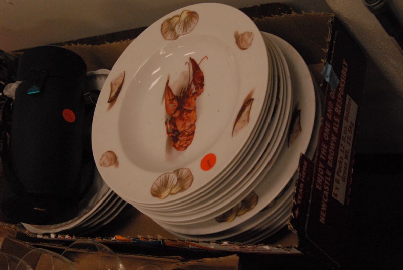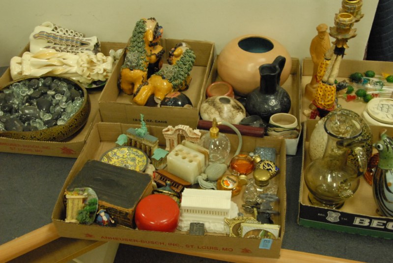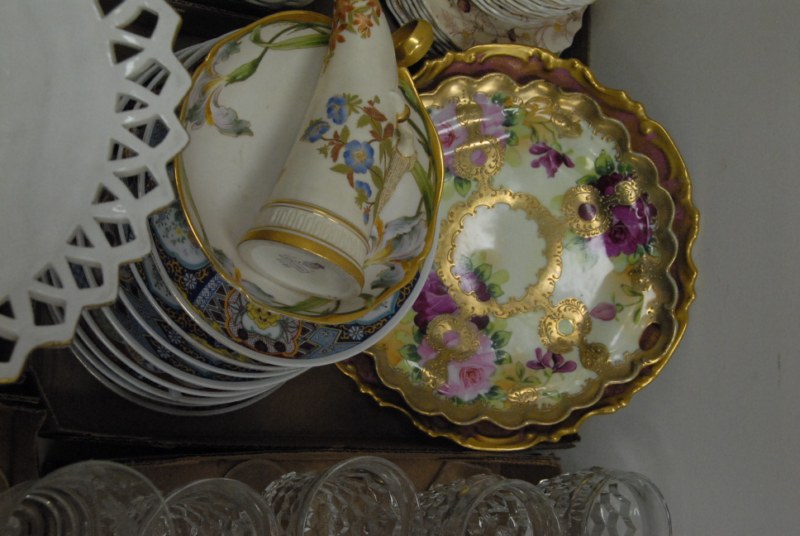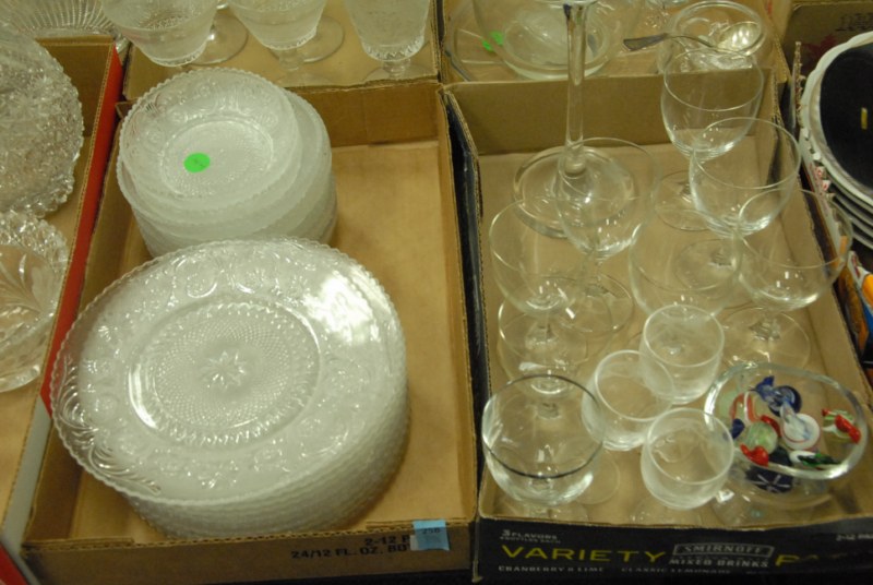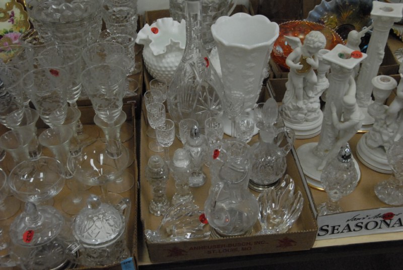 9 box lots to include Fostoria stemware, crystal salt and pepper shakers, figural candlesticks, Carnival glass bowls, cups, saucers, decanters, large Italian pottery covered piece.
