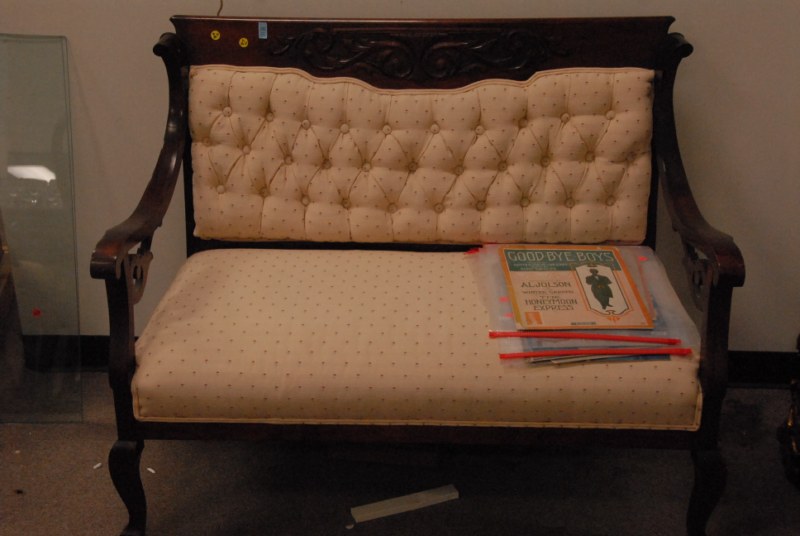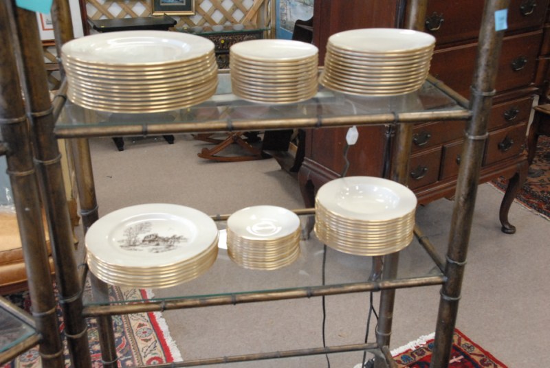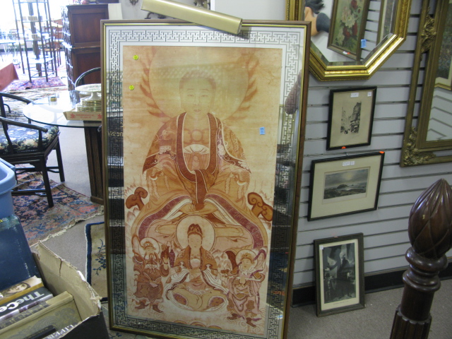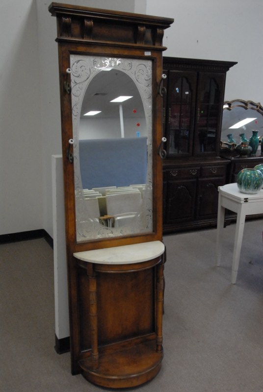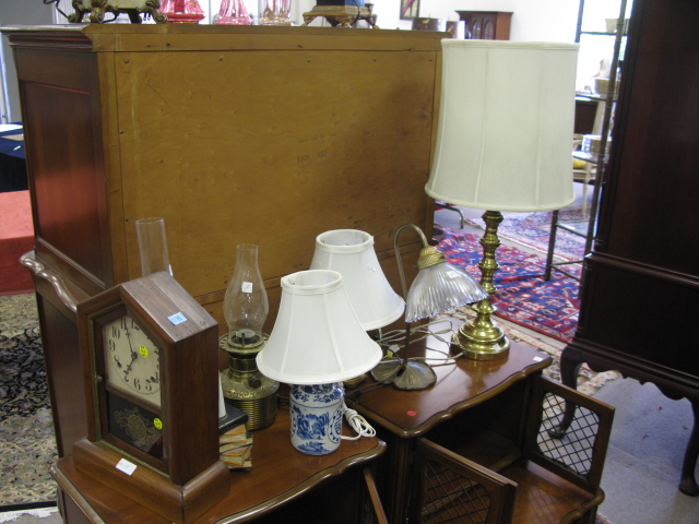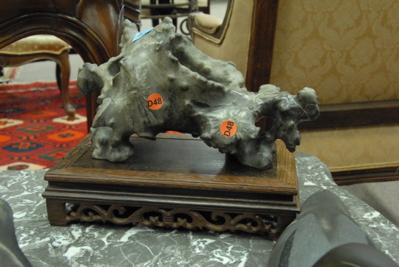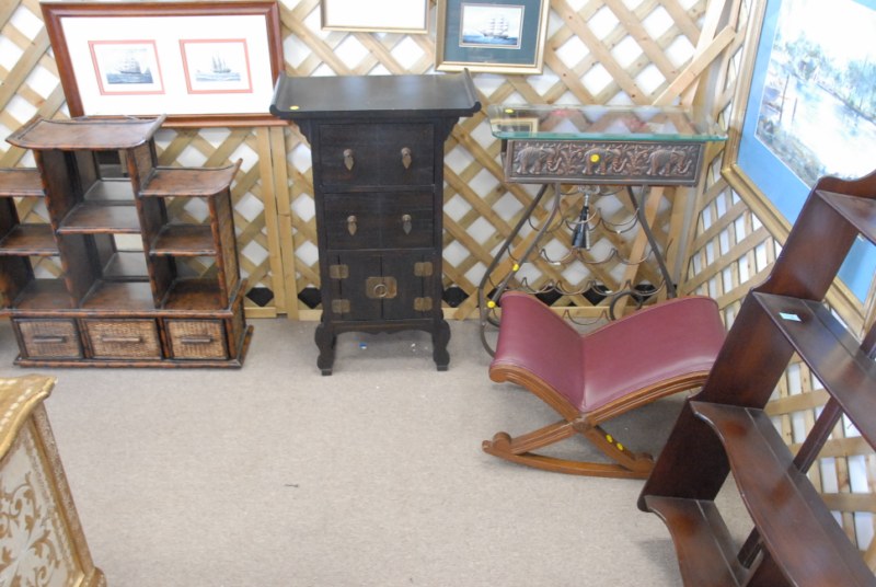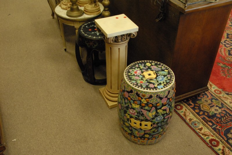 14 pc lot to include porcelain garden seat, Oriental style stand, pedestal, marble top table, small cabinet, candlesticks, figures, footstool, and chair