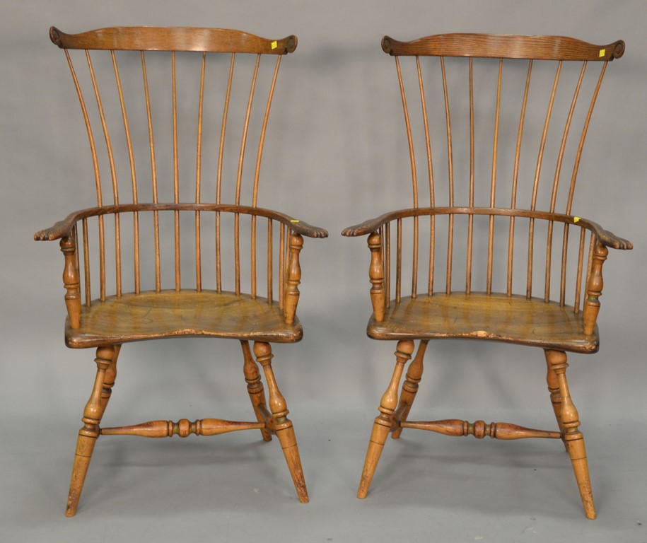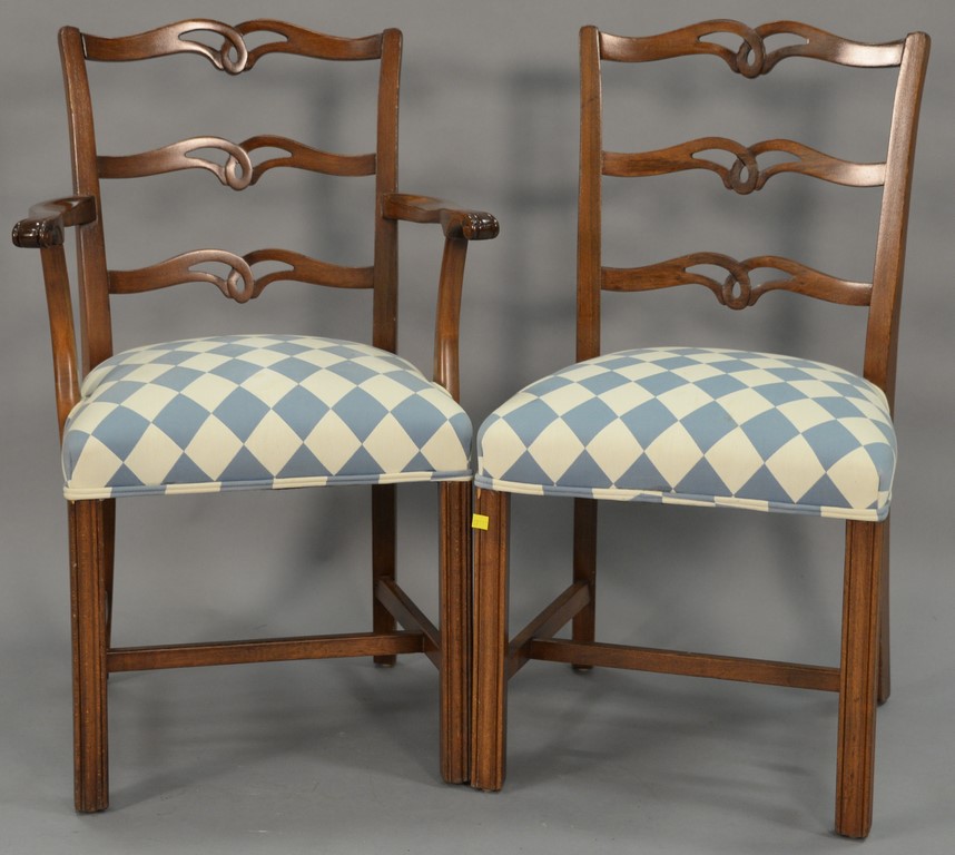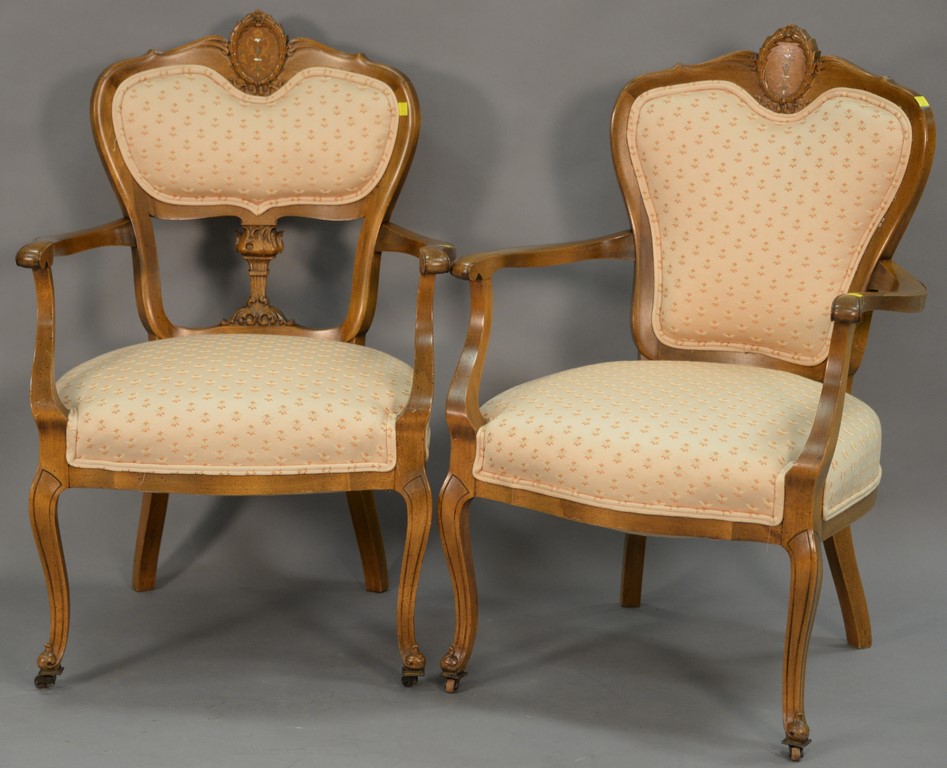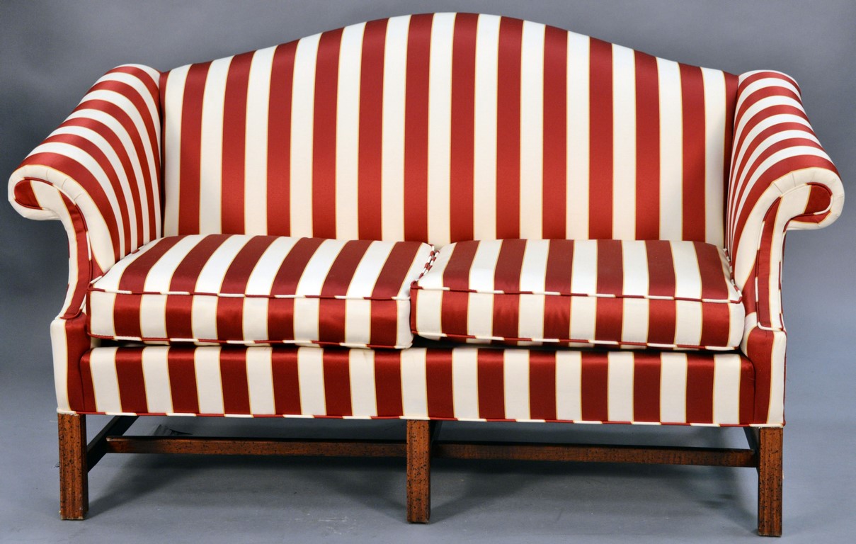 Pair of upholstered Chippendale style loveseats with camel backs, upholstery in excellent condition. lg. 60 in.