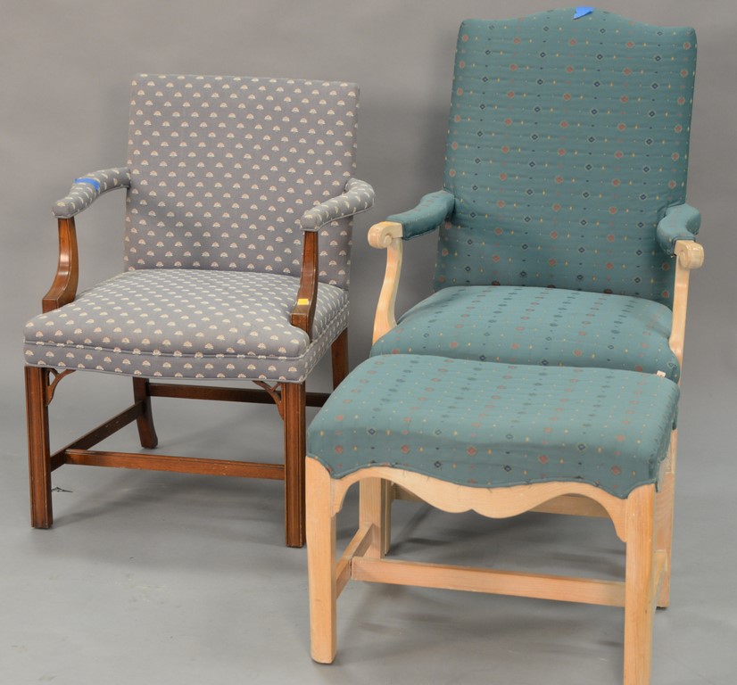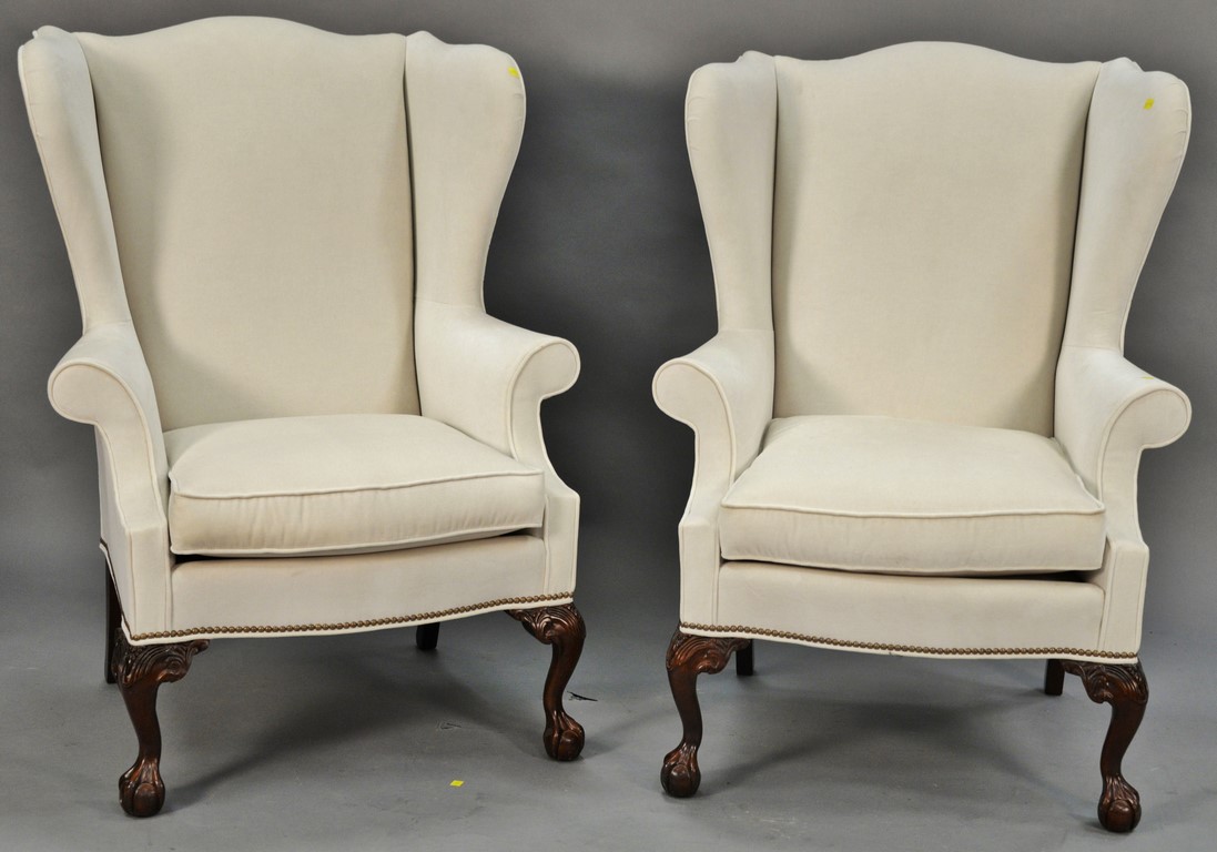 Pair of mahogany Chippendale style wing chairs with ball and claw feet, off white suede upholstery, like new.
