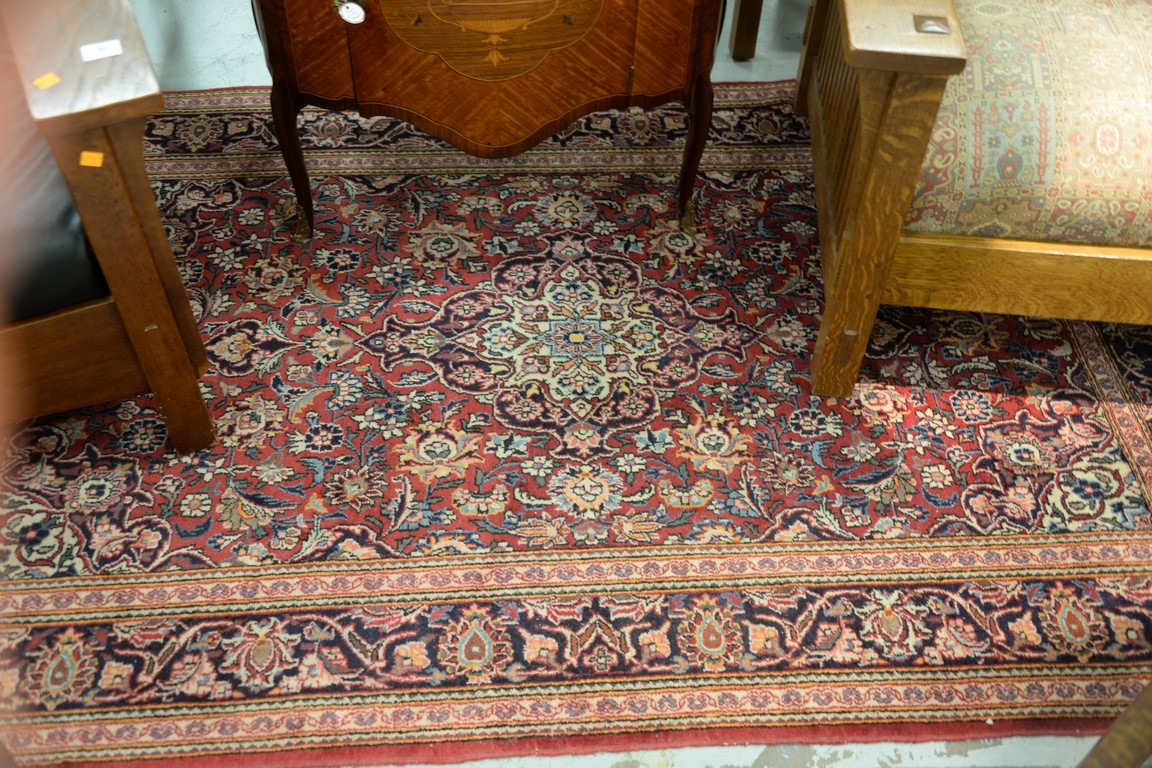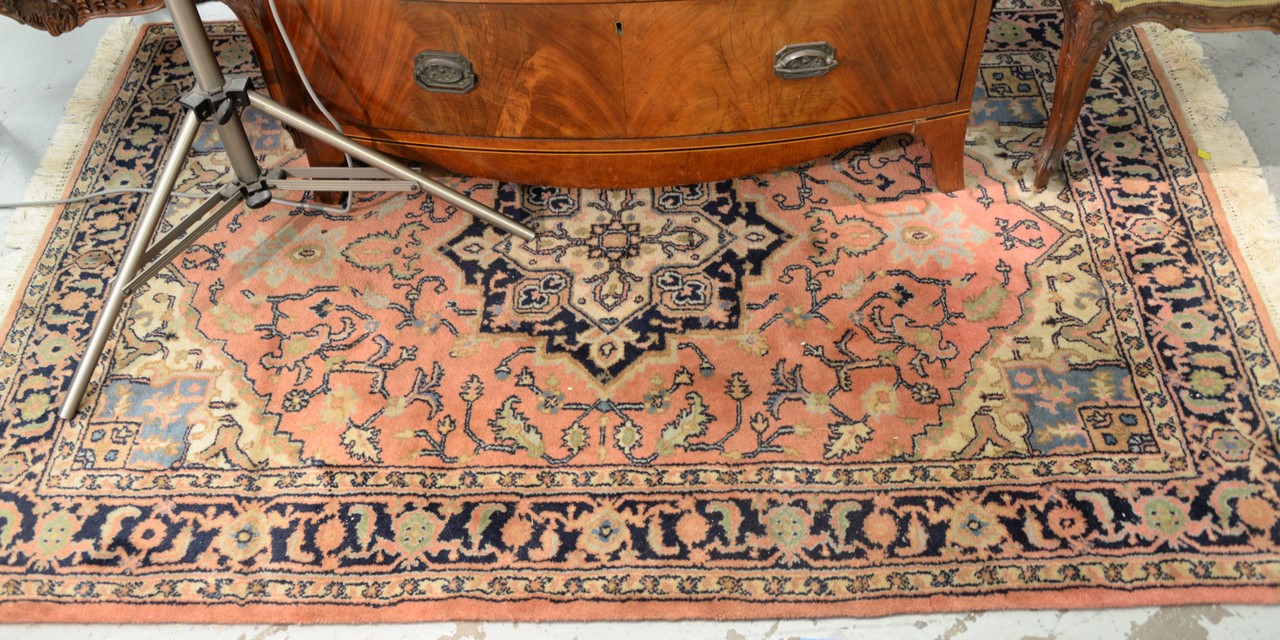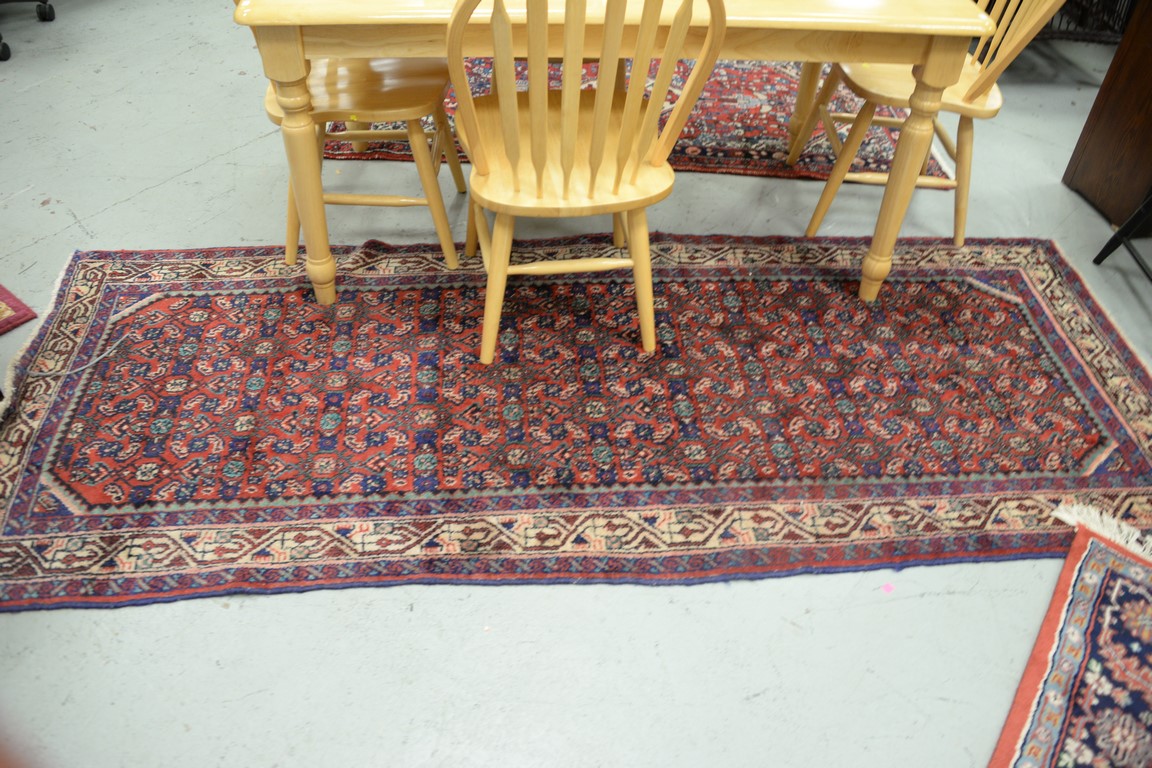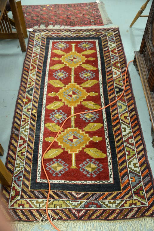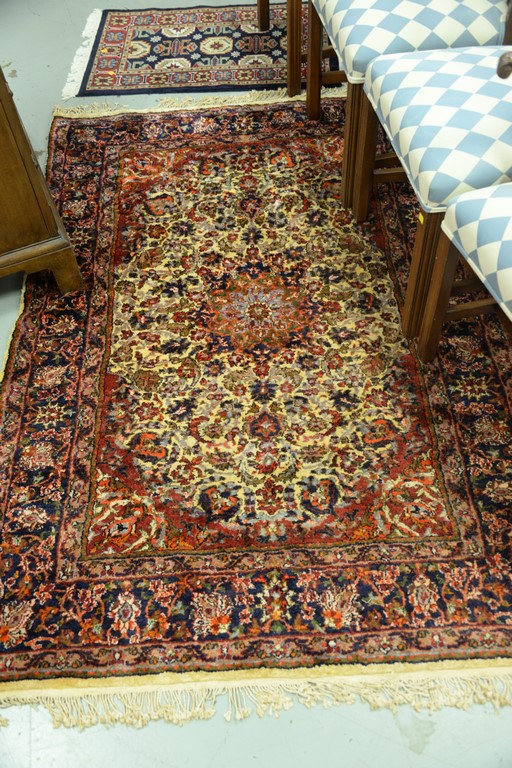 Three piece lot to include Oriental throw rug, 4′ x 6′ and two Oriental mats 1’1 x 3′ and 2′ x 3′.