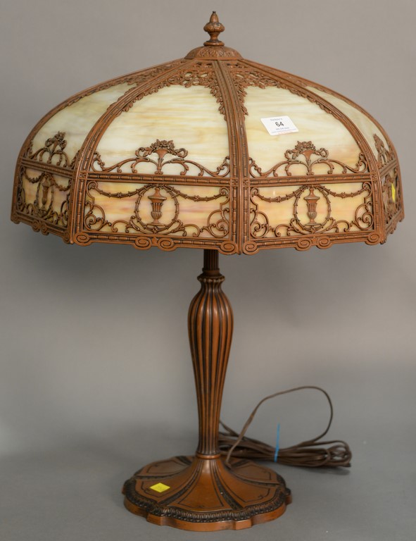 Panel shade table lamp with sixteen separate panels with filigree. ht. 24 in. dia. 19 in.