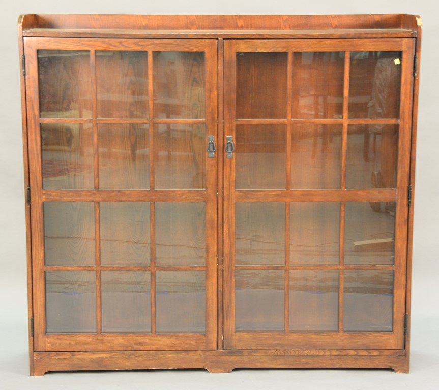 Mission oak style two door bookcase, late 20th century veneer damage. ht. 60 in. wd. 63 in. dp. 13 in.