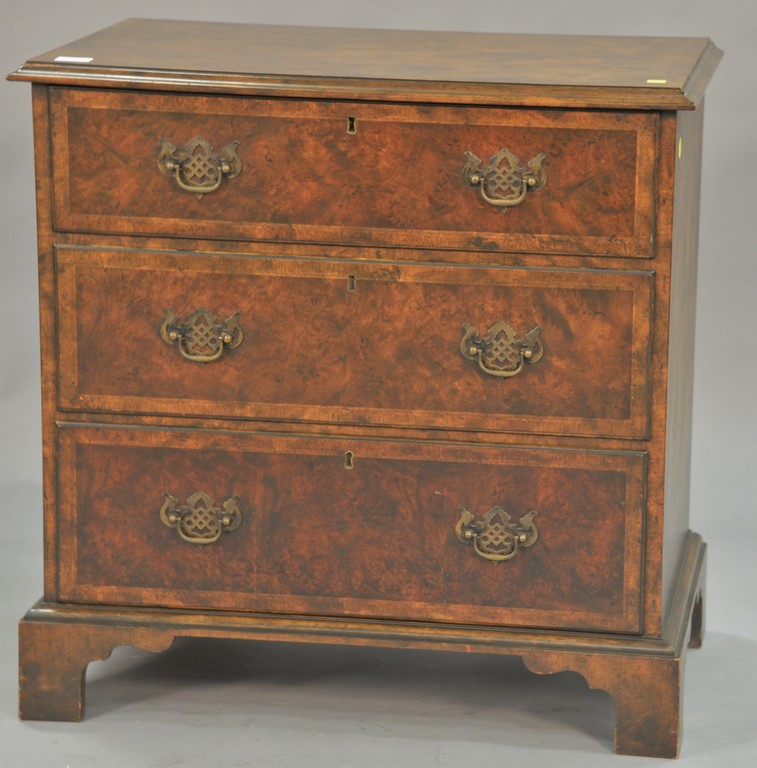 Baker three drawer inlaid Chippendale style chest. ht. 30 in. wd. 30 in. dp. 18 in.