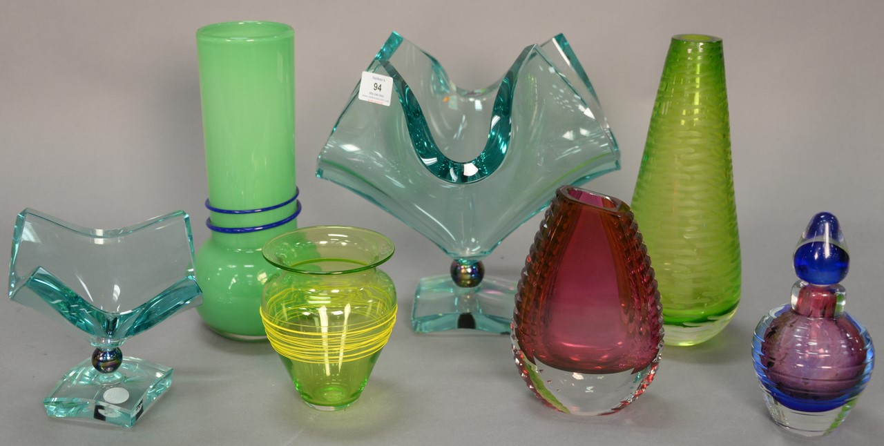 Seven piece lot to include two threaded art glass vases signed indistinctly, three vases with cut and etched sides, and two signed Evan’s molded glass bowls. ht. 5 1/2 in. to 11 in.