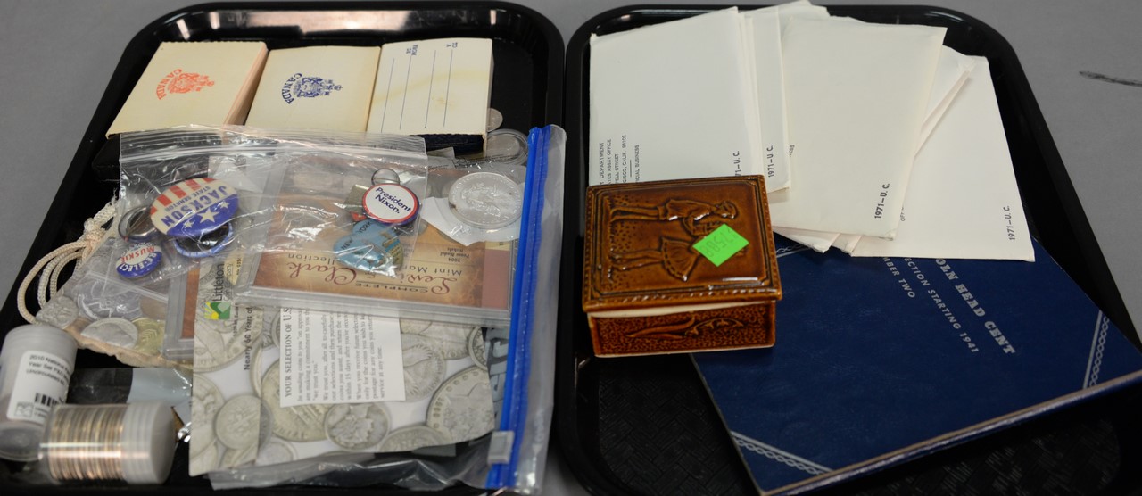 Coin lot to include 10 sets of Kennedy 1971 unc coin sets, a roll of Kennedy 67, 68, & 69 clad half dollars, book of pennies, 1 Eisenhower unc s. dollar, 2 Canadian s. dollar, 5 Kennedy half dollars, 1 Kennedy clad 1965 nickel, various coins, silver eagle.