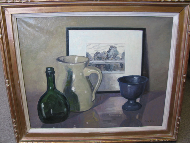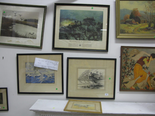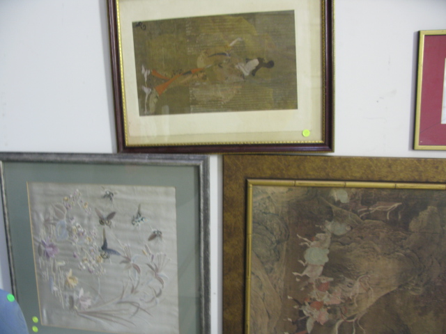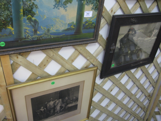 Four prints House of Art Parish type print and print of early car with 2 people.