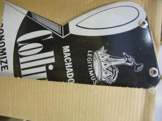Box lot of 8 Collinsville Axe Company original signs in Spanish with mounting brackets to hang them.