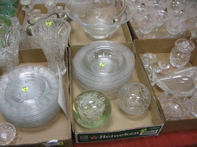 Six box lots of pressed glass and crystal, plates, pitcher and bowl sets, decanters, dolphin candlesticks, bowls, large paperweight etc.